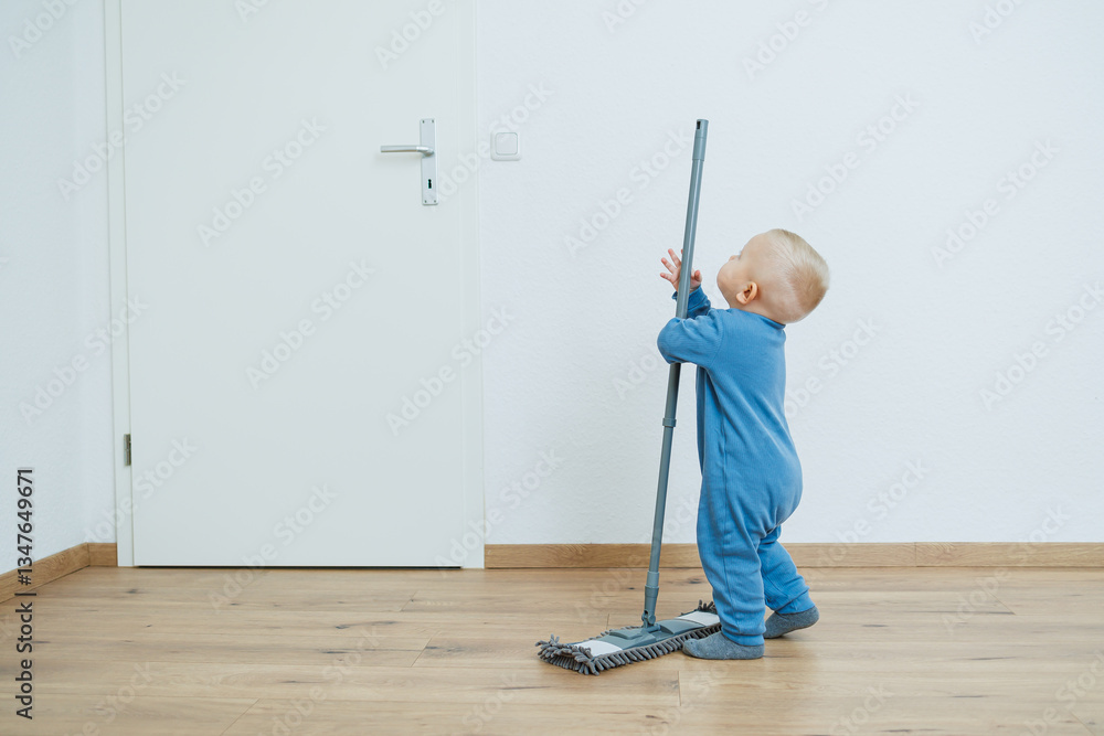 Innocent Little Helper A Cheerful Toddler Pretending to Mop the Floor with Enthusiasm in a Bright, Colorful Room, Spreading Joy and Happiness All Around, Filling the Space with Delightful Energy