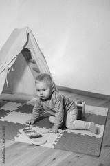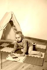 A cheerful and joyful baby happily plays with a colorful and vibrant xylophone inside a cozy and warm tent, embodying the pure joy of childhood exploration and creativity within a loving home setting