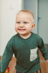 A Joyful Toddler, Radiating Happiness and Delight, Smiling Brightly While Engaging in Play in a Vibrantly Colorful Room Filled with Natural Light and Wonderous Playthings all Around