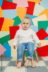 An adorable toddler is happily sitting on a stool, surrounded by a vibrant, colorful background filled with creative art, creating a delightful atmosphere that reflects childhood joy and innocence