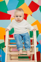 This adorable toddler is joyfully climbing a wooden ladder that stands out against a vibrant and colorful abstract background, embodying the spirit of childhood exploration and playful creativity