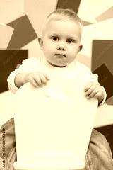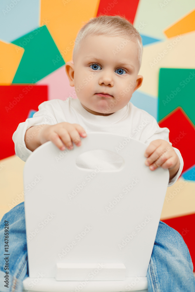 Adorable Baby Sitting on a White Chair in Colorful Playroom Setting