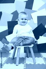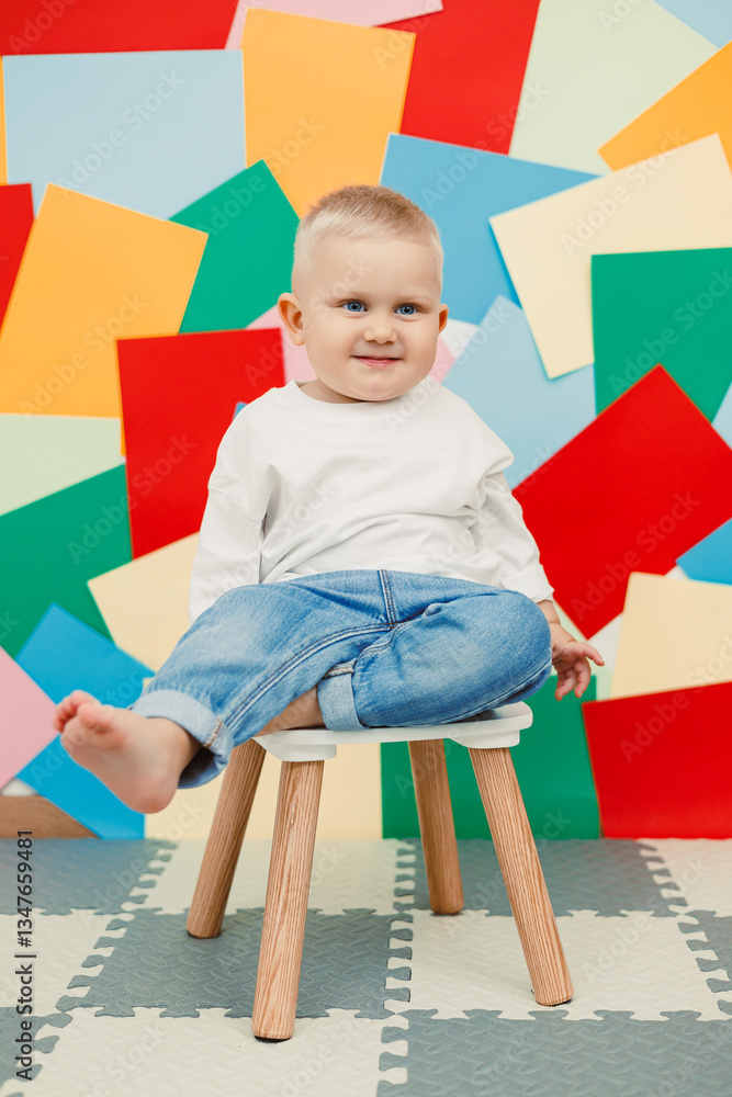 A Joyful Happy Child is Sitting on a Simple Stool, Right Against a Brightly Colorful Background Made of Various Craft Paper Shapes, Exuding Creativity and Playfulness in a Fun Atmosphere