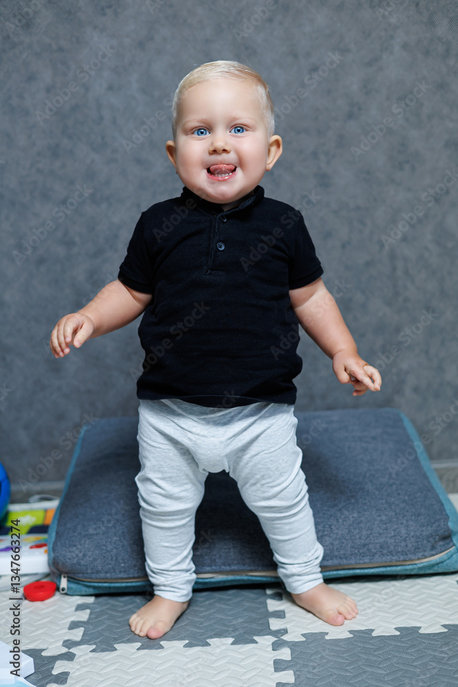 A cheerful toddler stands on a colorful play mat, brightening the indoor space around them, embodying innocence and happiness while capturing the essence of childhood exploration and playful learning