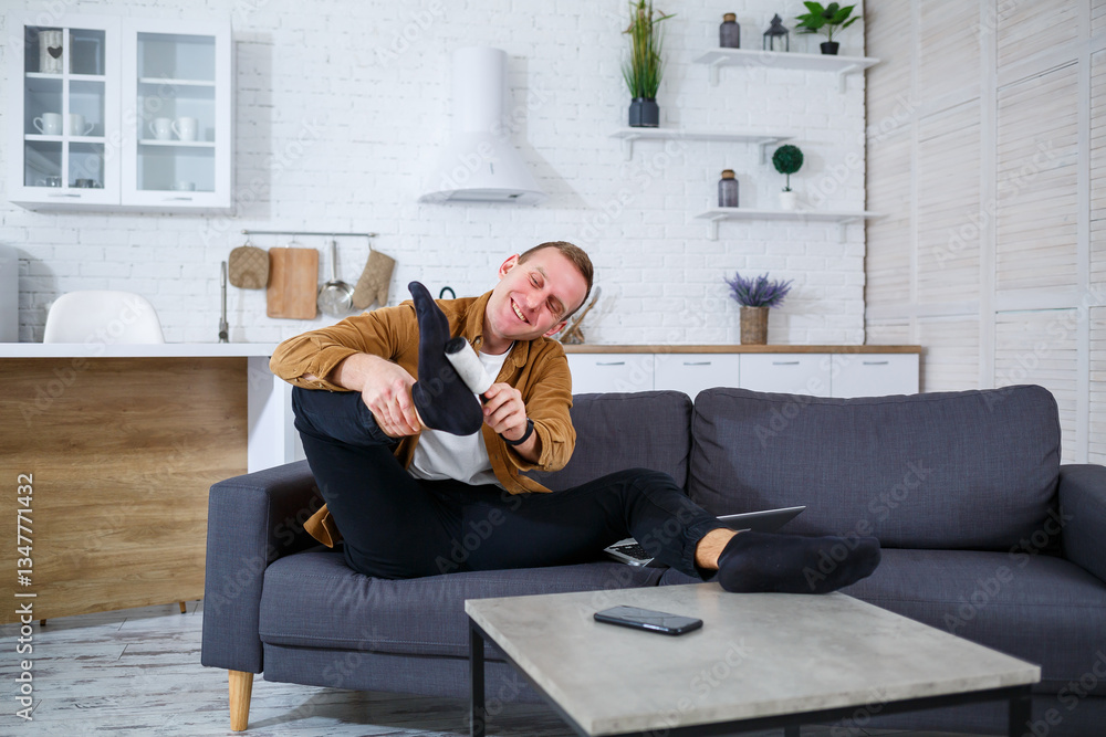 In a minimalist living room, a casually dressed man is playfully adjusting his trendy shoes while relaxing on a plush couch, his chic outfit matching the cozy atmosphere perfectly