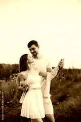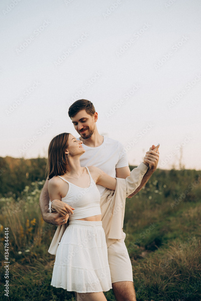 A joyful couple embraces tightly in a beautiful and serene natural setting during the golden hour, as the sun casts a warm glow, creating a stunning backdrop for their delightful shared adventure