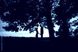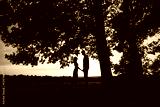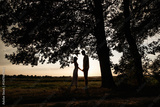 In a tranquil setting at dusk, a couple stands silhouetted against the beautiful trees, holding hands romantically in a serene landscape that embodies their connection and affection for one another