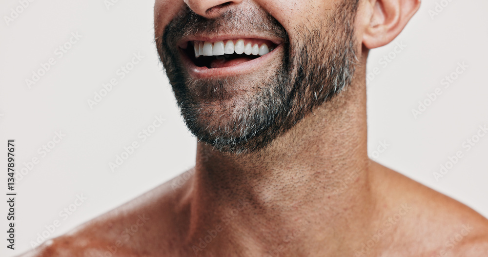Happy, teeth and beard of man in studio for wellness, health and cosmetics for grooming. Dermatology, skincare and face closeup of person for hygiene, facial care and dental smile on white background