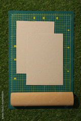 Drawing and paper materials for upcycling on green background, top view