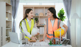 Female architect or engineer wearing hard hat is examining digital blueprints on tablet at construction site. She is determined and confident in defining the strategy for the development of the projec