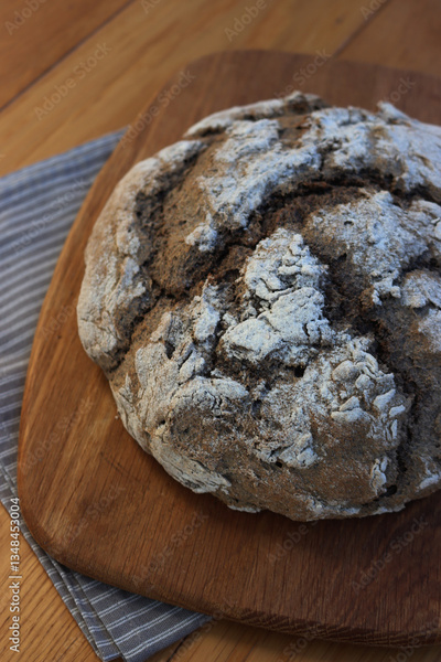 Homemade whole buckwheat bread on a wooden cutitng board on a table