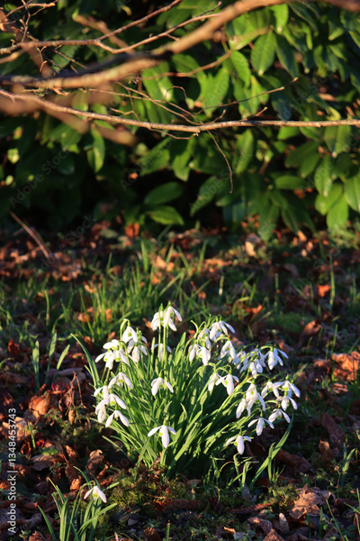 Many white Snowdrop flowers in the garden . Galanthus nivalis on springtime