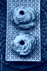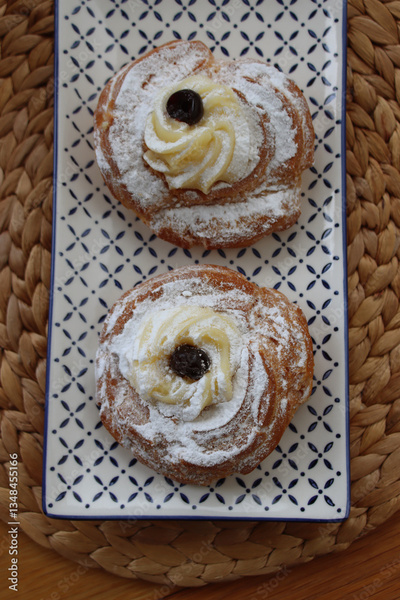 Two Italian fried Zeppole on a ceramic blue and white tray for St. Joseph (Father’s day)