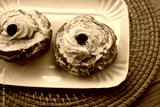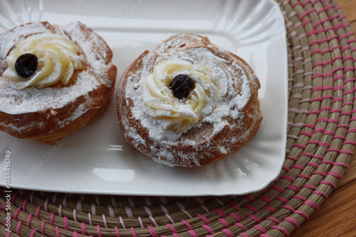 Two Italian fried Zeppole on a ceramic white tray for St. Joseph (Father’s day)