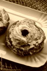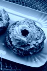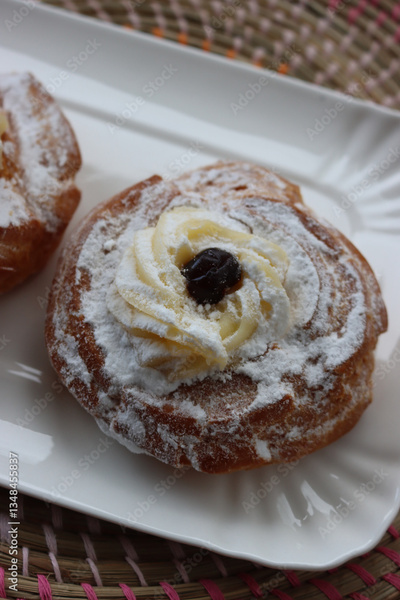 Two Italian fried Zeppole on a ceramic white tray for St. Joseph (Father’s day)