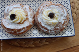 Two Italian fried Zeppole on a ceramic blue and white tray for St. Joseph (Father’s day)