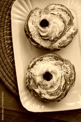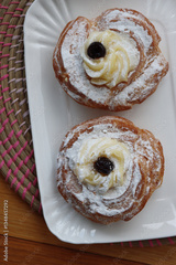 Two Italian fried Zeppole on a ceramic white tray for St. Joseph (Father’s day)