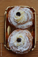 Two Italian fried Zeppole on a golden cardboard tray for St. Joseph (Father’s day)