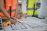 An architect or engineer is reviewing a digital blueprint on a tablet at a construction site. They are focused and confident in defining a strategy for the development of the project.