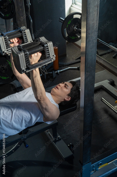 ダンベルで筋トレをする日本人男性
