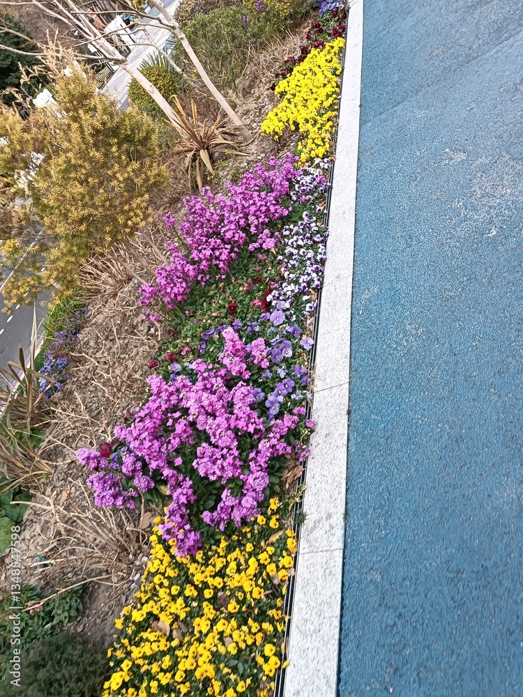 a beautiful spring with flowers and blooming trees in the city park in Shanghai city, China