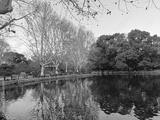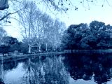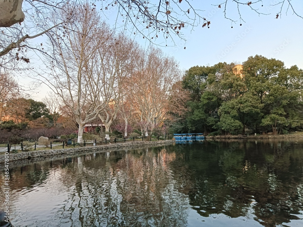 a beautiful spring with flowers and blooming trees in the city park in Shanghai city, China