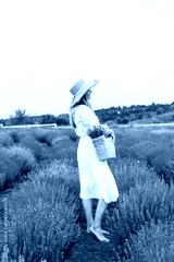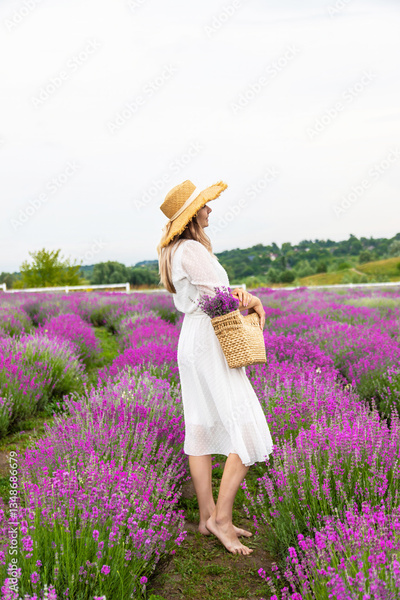 Woman lavender field. Happy carefree woman in white dress walking through lavender field.