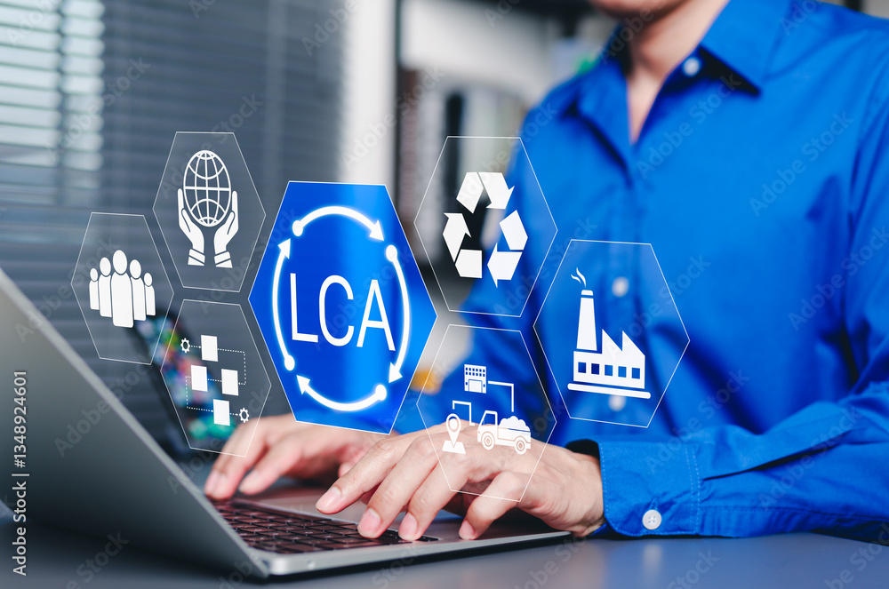 LCA, Life Cycle Assessment and Sustainability Concept. Businessman using laptop with Life Cycle Assessment (LCA) icons, representing recycling, manufacturing, logistics, and environmental impact.