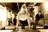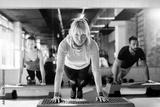 Professional female trainer at gym working push ups.