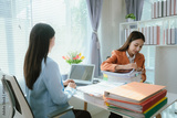 Businesswoman analyzes financial data in modern office, reviews charts and reports, plans investment strategies, and discusses growth opportunities with colleagues to drive organizational success.