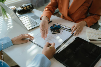 The salesperson meets with the new owner after signing the sales contract. This transaction includes financing, insurance, and legal documents to ensure a smooth and safe car sale or lease process.