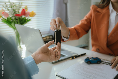 The salesperson meets with the new owner after signing the sales contract. This transaction includes financing, insurance, and legal documents to ensure a smooth and safe car sale or lease process.