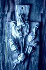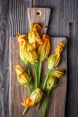 Zucchini flowers on wooden cutting board on rustic table. Fresh squash blossoms on home kitchen top view. Aesthetic food photography