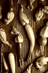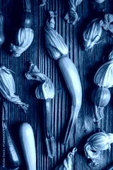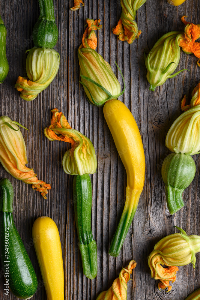 Top view of young fresh zucchini with flowers on rustic wooden table. Fresh zucchini blossoms close up. Aesthetic food photography