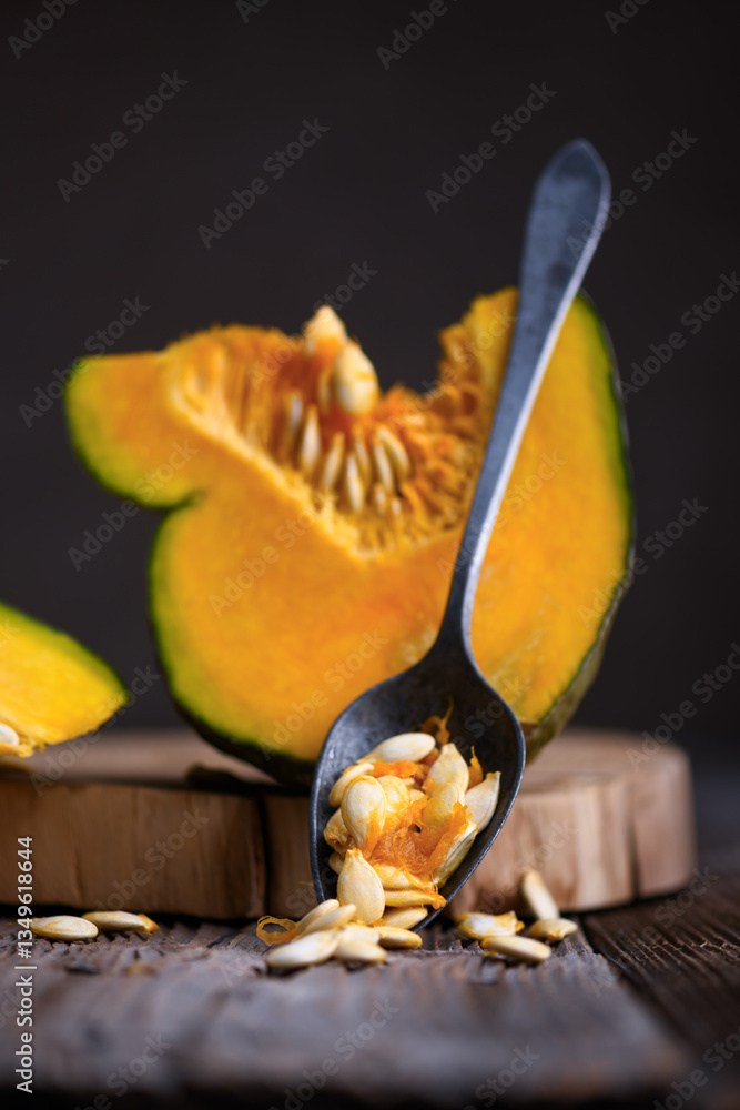 Spoon with pumpkin seeds and pumpkin piece on wooden table close up. Food photography
