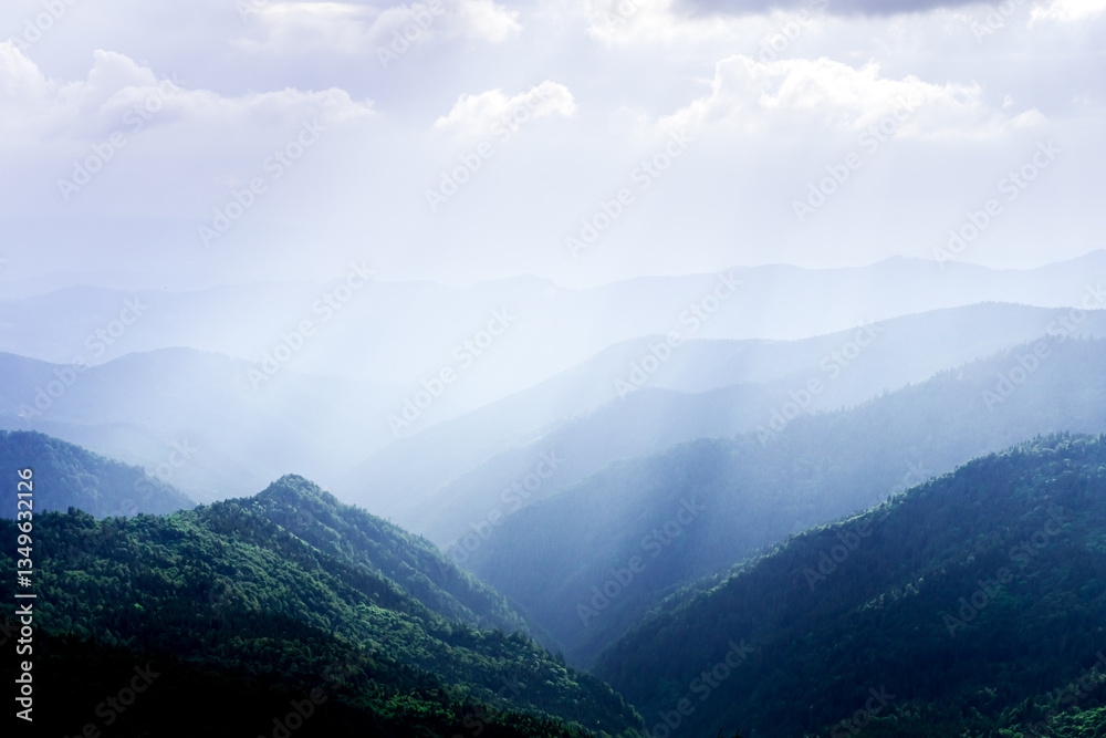 Picturesque blue mountain ranges glowing by sun rays in the spring mountains. Landscape photography