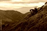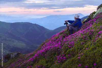 Photographer capturing the beauty of rhododendron-covered mountain meadows at sunrise. Purple light enhances the landscape