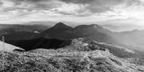 Panorama of spring mountains with lush green slopes covered in vibrant pink rhododendron flowers, glowing in warm morning light and surrounded by misty peaks