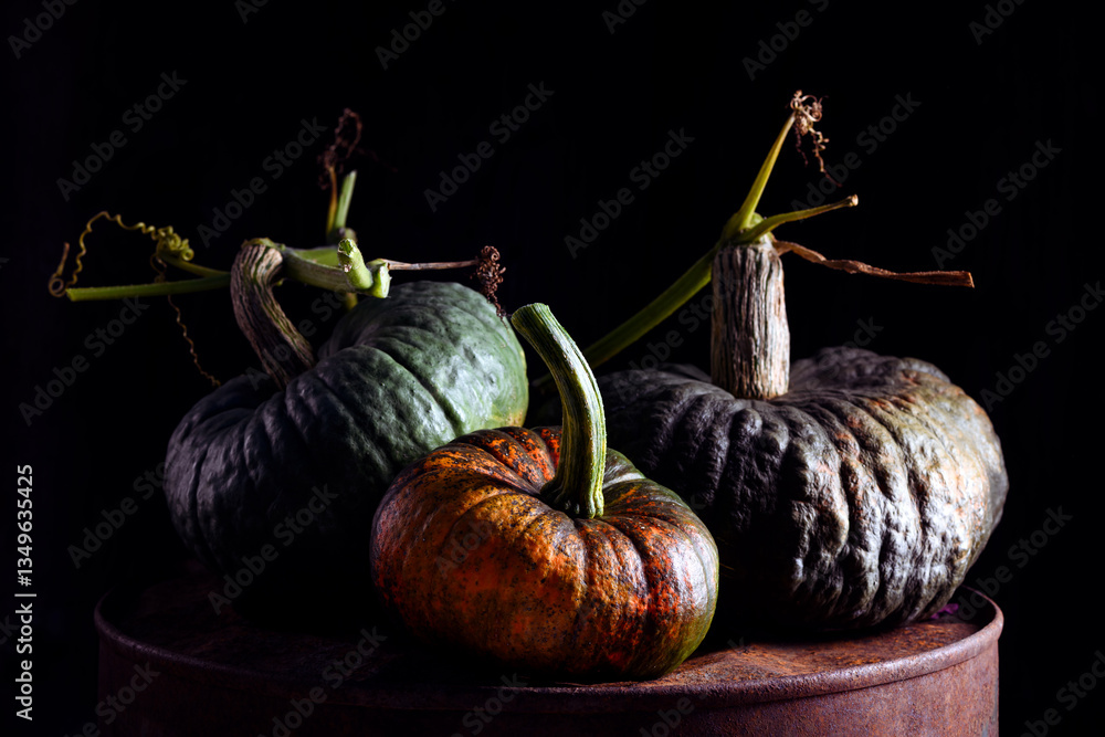 Old rusty barrel with three pumpkins on dark background close up. Food photography