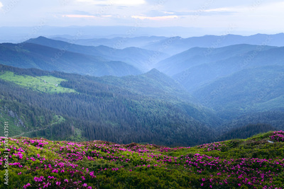 Mountain meadow covered with blooming rhododendrons, glowing in the soft orange sunrise light. Spring landscape photography