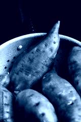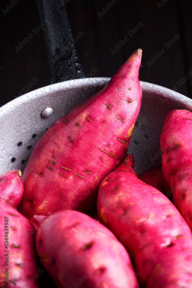 Just washed pink sweet potatoes in metal colander close up. Food photography