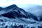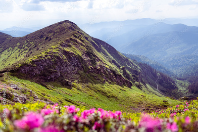 Golden morning light shining on rhododendron-covered mountain slopes, with misty blue ridges stretching into the horizon. Serene landscape photography