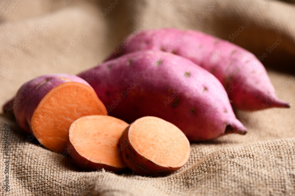 Close up of pink organic sweet potatoes with orange flesh, whole and sliced, on sackcloth. Food photography
