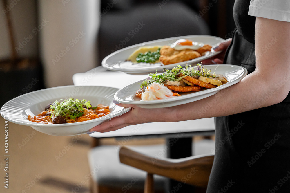 A waiter holds three dishes: pasta with meatballs, breaded cutlet with mashed potatoes and vegetables, and sliced vegetables with coleslaw, showcasing gourmet meal variety.