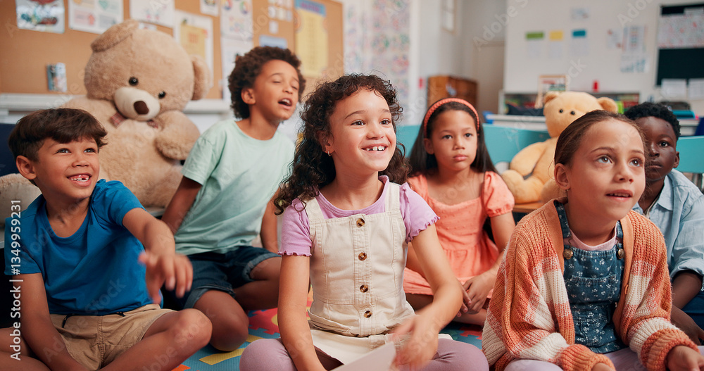 Lesson, education and youth with students in classroom for child development, future and learning. Academy, growth and scholarship with group of kids in school for knowledge, happy and study