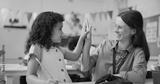 Education, teacher and high five student in classroom for lesson support, writing activity and learning progress. People, educator and girl with fine motor skills celebration or knowledge development