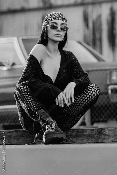 Fashion woman street. Sexy fashion woman sitting outdoor. Dangerous areas. Fashionable brunette in black jacket bandana and sunglasses in urban style. Lifestyle of female hipster.