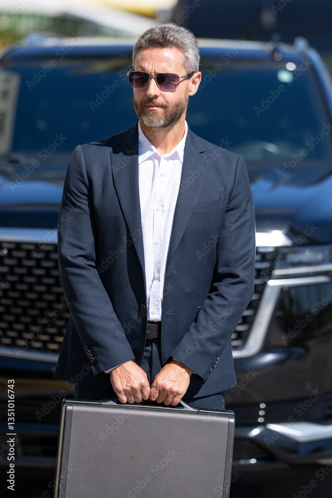 Mature businessman outdoors. Rich businessman standing next to a luxury car. Global business. Successful business. Elegant businessman standing in front of expensive car. Successful businessman.
