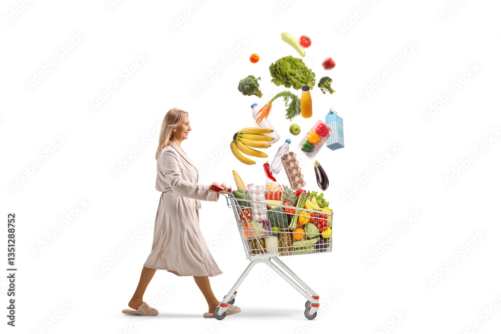Woman in a bathrobe and sleepers pushing a shopping cart with falling groceries