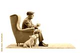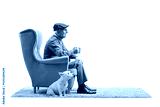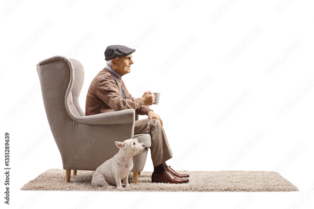 Elderly man with a dog sitting in an armchair and holding a cup